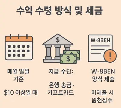 ⚠️ 세금 유의사항: 미국 세법상 W-8BEN 양식 제출이 필수이며, 미제출 시 원천징수(최대 30%) 발생.