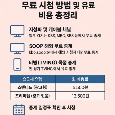 2025년 현재, ‘2025년 프로야구 무료 시청 방법’을 찾는 팬이라면 전략적인 선택이 중요해졌습니다. 일부 무료 경기는 여전히 지상파나 해외 SOOP에서 시청할 수 있지만, 전 경기 생중계 및 다시보기는 티빙 유료 구독이 필수인 시대가 된 것입니다.