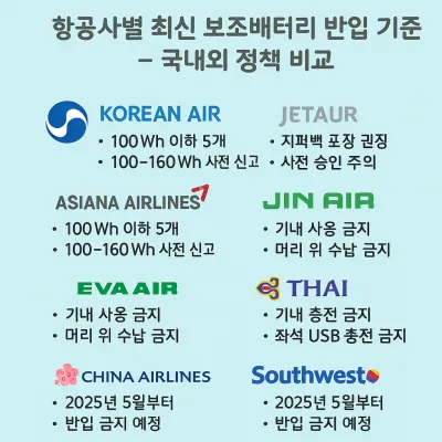 - 순항 중에도 충전 금지: 2025년부터 대부분 항공사는 기내에서 보조배터리로 기기 충전 또는 보조배터리 자체 충전 모두 금지.