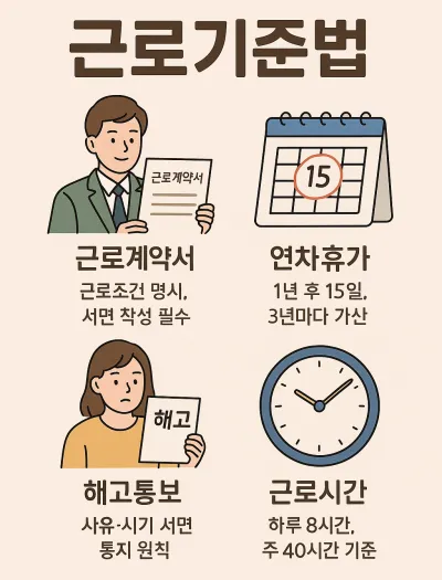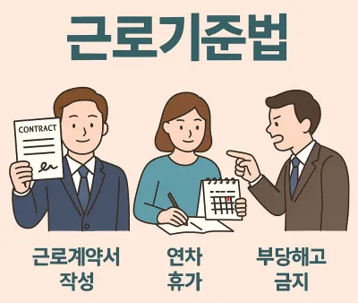 이 글에서는 근로계약서 작성법, 연차휴가 규정(근로기준법 제60조), 해고 통보 절차(제27조), 근로시간 기준, 그리고 실제 위반 사례까지 핵심만 짧고 명확하게 정리했습니다.