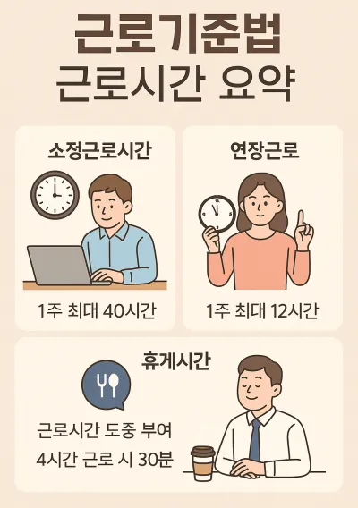 | 근로시간 | 하루 8시간, 주 40시간 | 초과근로는 동의 필요 |