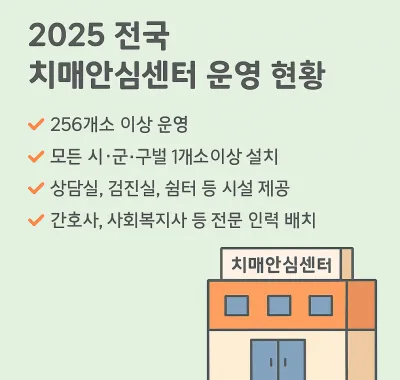 2025년 현재, 전국 256개소 이상의 치매안심센터가 운영 중입니다. 모든 시·군·구에 최소 1곳 이상 있으며, 센터 규모와 시설은 지역 특성에 맞게 다르게 구성됩니다.