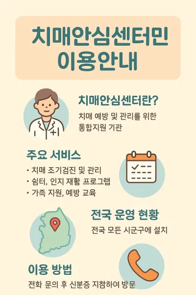 치매안심센터는 보건복지부와 지방자치단체가 협력해 설치한 치매 예방 및 관리 전문 기관입니다. 전국 모든 시·군·구 보건소에 설치되어 있으며, 치매 환자뿐만 아니라 60세 이상 어르신이라면 누구나 이용할 수 있습니다.