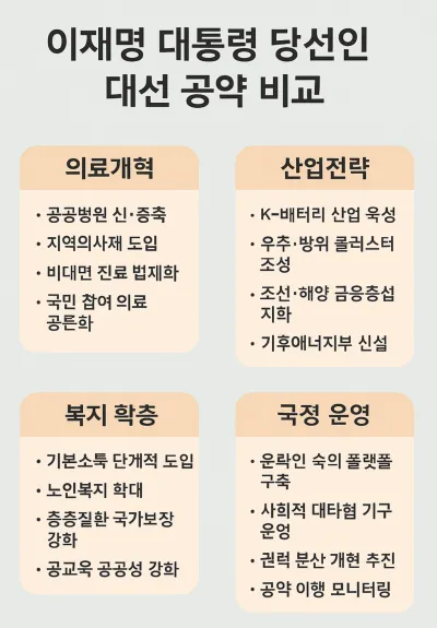 제21대 대한민국 대통령으로 당선된 이재명 대통령 당선인의 대선 공약은 단순한 선거용 슬로건이 아닌, 사회 전반의 불균형을 바로잡고 지속가능한 미래로 나아가기 위한 실행 중심의 정책 설계로 구성되어 있습니다. 이 글에서는 주요 공약을 의료, 산업, 복지, 정치 시스템이라는 4가지 축을 중심으로 심층 분석합니다.
