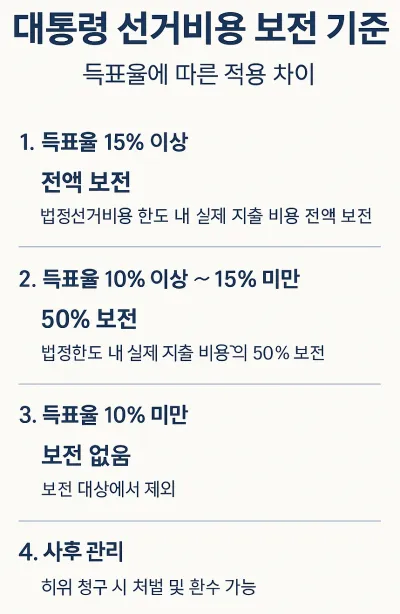 이처럼 대통령 선거비용 보전 기준은 명확하게 구분되어 있으며, 후보자는 득표 목표에 맞춘 전략적 예산 계획이 필수입니다.