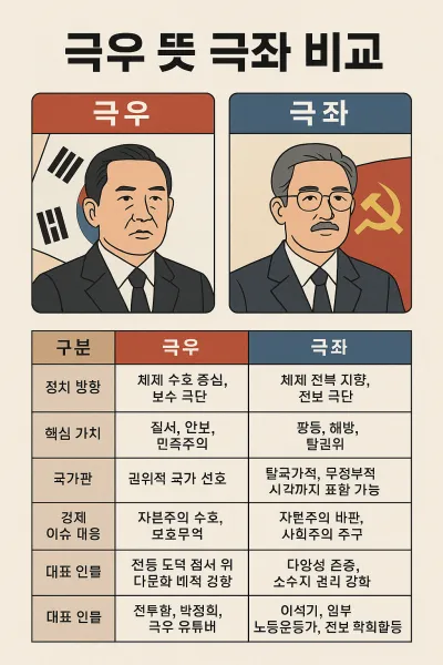 정치적 이념 스펙트럼의 양 끝단에는 보수와 진보를 넘어서 극단적인 방향으로 치우친 두 개념이 존재합니다. 바로 극우와 극좌입니다. 이들은 단순한 정치 성향이 아닌, 체제에 대한 전면적인 재구성을 주장하거나 기존 질서를 절대시하는 태도를 보입니다. 본 글에서는 극우 뜻 극좌 비교를 중심으로 이념적 차이를 설명하고, 한국 정치사 속 인물 및 사건 사례를 통해 현실 속 구현 양상을 분석합니다.