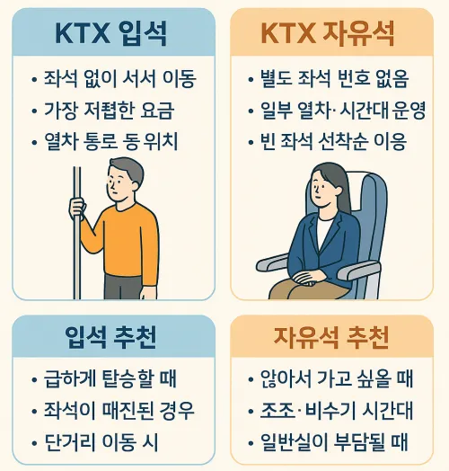 여행, 출장, 귀성길까지 언제든 KTX를 이용할 때 입석과 자유석의 조건, 가격, 예매 방법을 미리 확인해 두면 더 똑똑한 철도 여행이 가능합니다.