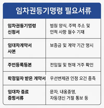 | 임차권등기명령 신청서 | 법원 공식 양식으로, 임차인 및 임대인의 인적사항, 주택 주소, 계약 정보 등 정확히 기재 |