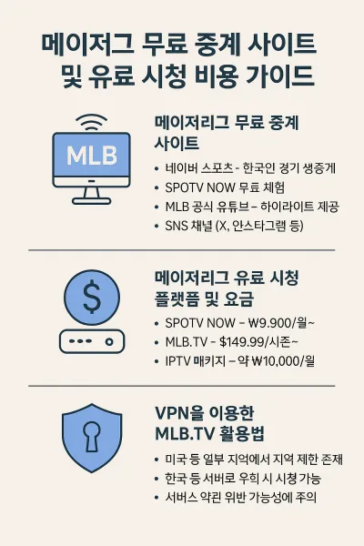 | 유료 | MLB.TV | $129~149/시즌 | 영어 | FHD | 전체 경기 제공, VPN 필요 |