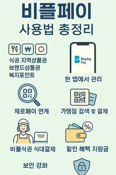 비플페이는 단순한 간편결제 앱이 아니다. 식권·지역상품권·온누리상품권·브랜드상품권을 하나의 앱에서 관리할 수 있는 통합 결제 플랫폼이다. 제로페이 인프라를 기반으로 하여 전국 약 76만 개 가맹점에서 사용 가능하며, 특히 전통시장과 소상공인 상권 활성화에 기여한다. 기업은 비플식권으로 직원 식대를 관리하고, 학교는 학생 복지 포인트를 지급하며, 개인은 할인된 상품권을 등록해 생활비를 절감한다. 앱 내에 고객센터·보안설정·FAQ까지 통합되어 있어 초보자도 쉽게 사용할 수 있다.