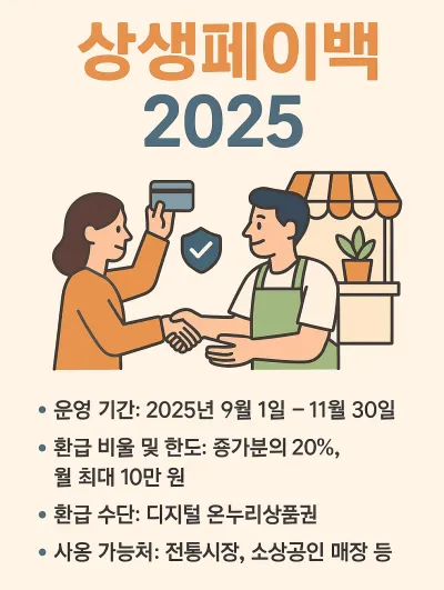 상생페이백 2025는 카드 사용 증가분을 환급해 가계의 실질 지출을 낮추고 전통시장·지역 소상공인 매출을 끌어올리는 내수 부양 장치다. 환급 수단은 디지털 온누리상품권이며, 2025년 9~11월 월별 소비가 2024년 월평균 대비 늘면 증가분의 일정 비율을 돌려준다.정부와 카드사, 온누리상품권 인프라가 결합된 형태로 설계되어 신청·조회·지급이 전부 온라인 중심으로 진행된다. 시행 공지와 언론 보도를 종합하면 핵심 요소는 △증가분 20% 환급 △월 10만 원, 총 30만 원 한도 △다음 달 15일 지급 △전통시장 등 약 12만7천~13만 가맹점 사용 가능이다.
