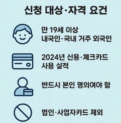 참여 대상은 만 19세 이상 내국인 및 국내 거주 외국인이다. 전년도(2024년) 본인 명의 신용·체크카드 사용 실적이 있어야 비교 기준을 산정할 수 있다. 간편결제는 가맹점 정보 식별이 가능하면 인정된다. 가족카드 사용분은 카드 명의자 실적으로 합산된다. 법인·사업자카드는 제외다. 카드 해지 전 사용분은 원칙적으로 인정되나, 개인정보 삭제 요청 등 특수한 경우 실적에서 빠질 수 있다.