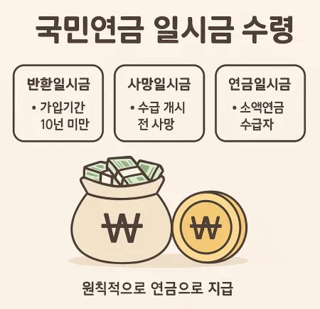 국민연금은 원칙적으로 매달 정기 연금으로 지급되지만, 특정 조건에 해당하는 경우에만 일시금 수령이 가능합니다.