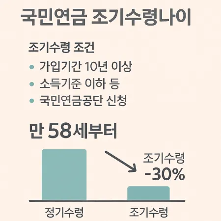 국민연금 조기수령은 만 58세부터 가능하지만, 그만큼 감액된 금액이 평생 적용됩니다.