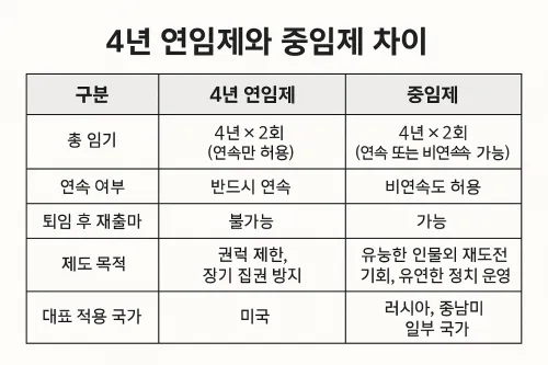 | 제도 목적 | 권력 제한, 장기 집권 방지 | 유능한 인물의 재도전 기회, 유연한 정치 운영 |
