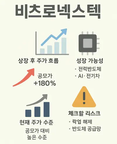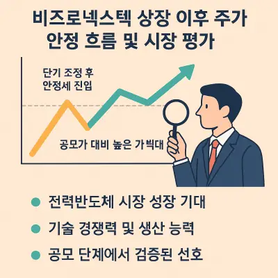 비츠로넥스텍은 공모주 단계에서부터 ‘대형 흥행 종목’으로 주목받았으며, 상장 후 실제 주가 흐름에서도 공모가 대비 강한 상승 흐름을 이어갔다. 전력반도체를 기반으로 한 기술 경쟁력이 시장에서 높게 평가되었고, AI·전기차 산업 확장과 맞물리면서 중장기 성장성에 대한 기대도 빠르게 확산되었다. 아래에서는 상장 직후 주가 흐름, 상장 후 안정화 과정, 현재 시장 평가, 향후 전망을 세부 항목별로 구분해 보다 깊이 있게 정리한다.
