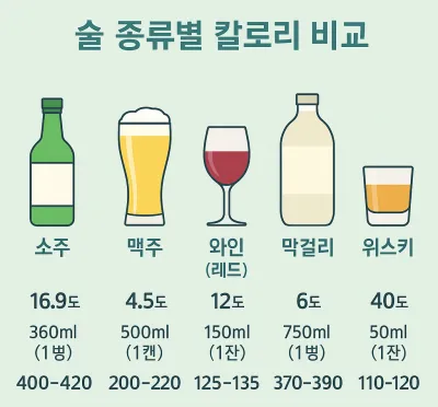 술은 종류에 따라 도수, 첨가 성분, 당분 함량이 다르기 때문에 칼로리도 큰 차이를 보입니다. 실제로 한 잔씩 마시는 양이 달라 열량을 비교하려면 동일한 1회 섭취량 기준으로 비교해야 정확합니다.