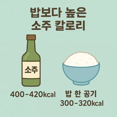 - 소주 한 병(360ml)은 약 400~420kcal로, 일반적인 식사보다 높은 열량을 지니고 있습니다.