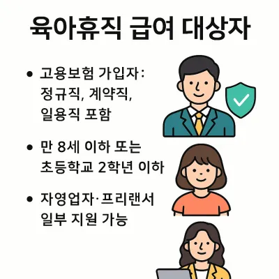 2025 육아휴직 급여 대상자는 고용 형태와 직종에 따라 차등 적용됩니다. 고용보험에 가입된 근로자는 물론, 일부 공무원도 별도 기준에 따라 수당을 받을 수 있습니다.
