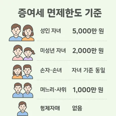 - 미성년 자녀: 10년간 2,000만 원까지 비과세