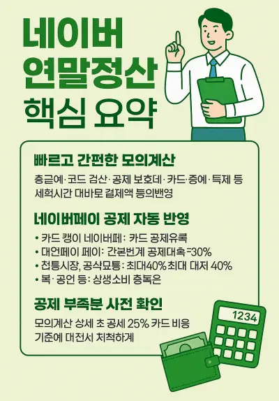 네이버 연말정산 모의계산은 복잡한 연말정산 계산을 간단하고 직관적으로 정리해 주는 필수 도구다. 네이버페이 공제 구조까지 자동 반영해 실제 연말정산 결과에 가까운 예상치를 확인할 수 있으며, 부족한 공제 항목을 사전에 파악해 전략적으로 소비 계획을 세울 수 있다.