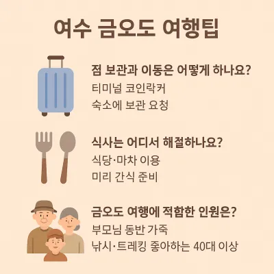 - 금오도는 도보 중심 섬입니다. 숙소 체크인 전 가방이 부담된다면, 여객선 터미널 내 코인락커 또는 숙소에 짐 맡기기 서비스가 가능합니다. 대부분의 민박에서 짐 보관을 흔쾌히 도와주며, 요청 시 항구 픽업도 가능하니 예약 전 문의해보세요.