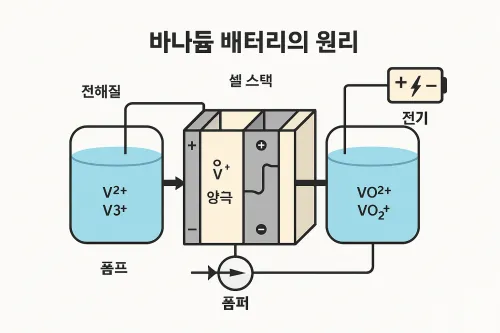 **바나듐 레독스 흐름전지(VRFB: Vanadium Redox Flow Battery)**는 바나듐 이온의 산화 상태 변화를 통해 전기를 저장하고 방출하는 방식의 배터리입니다. 리튬이온 배터리와 달리 전해질이 외부 탱크에 저장되고, 펌프를 통해 셀 내부로 주입되어 반응이 일어나는 구조입니다.
