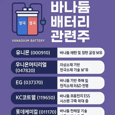 중소기업 중에는 전해질 정제, 시스템 통합 기술을 확보한 기업들도 있으나, 위 다섯 종목은 바나듐 관련 테마주로 가장 주목받고 있습니다.