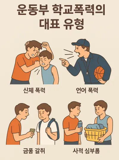운동부에서 자주 발생하는 폭력 형태는 일반 학폭보다 다양하고, 규모가 큰 편이다. 아래 유형들은 실제 신고 사례에서 가장 반복적으로 등장하는 패턴이다.