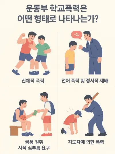- 신체폭력·언어폭력·금품 갈취·지도자 폭력 등이 반복적으로 나타남