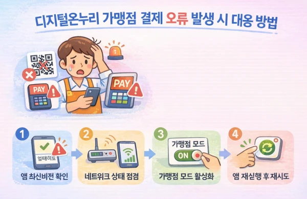 이러한 문제는 ‘디지털온누리가맹점오류’, ‘디지털온누리 가맹점 결제 안됨’ 등의 키워드로 자주 검색되며, 특히 점심·저녁 피크타임에 발생할 경우 영업에 직접적인 타격을 준다.