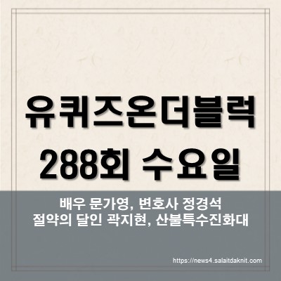tvN 대표 휴먼 토크쇼 **‘유 퀴즈 온 더 블럭 288회’**가 오는 2025년 4월 9일 수요일 저녁 8시 45분에 방영됩니다. 이번 방송은 각기 다른 영역에서 뜨거운 진심으로 살아가는 사람들의 이야기를 중심으로 꾸며져 시청자에게 깊은 울림을 전달할 예정입니다. 유 퀴즈 온 더 블럭 288회에서는 20년 차 배우 문가영, 사이버 레커 최초 법정에 세운 정경석 변호사, 극강의 절약 달인 곽지현, 그리고 산불 현장의 숨은 영웅 산불특수진화대원까지, 각 출연자의 독보적인 인생 여정이 펼쳐집니다.