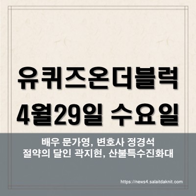 매주 다양한 사람들의 진솔한 이야기를 전하며 감동을 주는 tvN 예능 프로그램 '유 퀴즈 온 더 블럭'. 오는 4월 9일 수요일 저녁 8시 45분에 방송되는 **'유 퀴즈 온 더 블럭 288회'**는 한층 더 특별한 출연진들과 함께합니다. 20년 차 배우 문가영, 사이버 레커를 법정에 세운 정경석 변호사, 실천형 절약 전문가 곽지현, 그리고 자연을 지키는 산불특수진화대 대원들이 바로 그 주인공입니다.